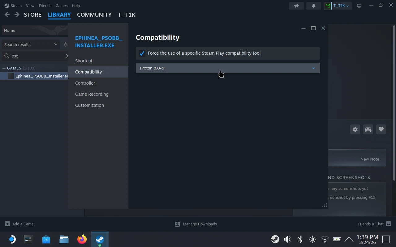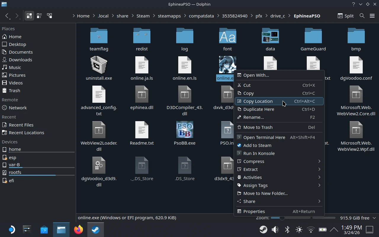 /home/deck/.local/share/Steam/steamapps/compatdata/3535824940/pfx/drive_c/EphineaPSO/). - Rename the shortcut to something like Phantasy Star Online: Blue Burst.