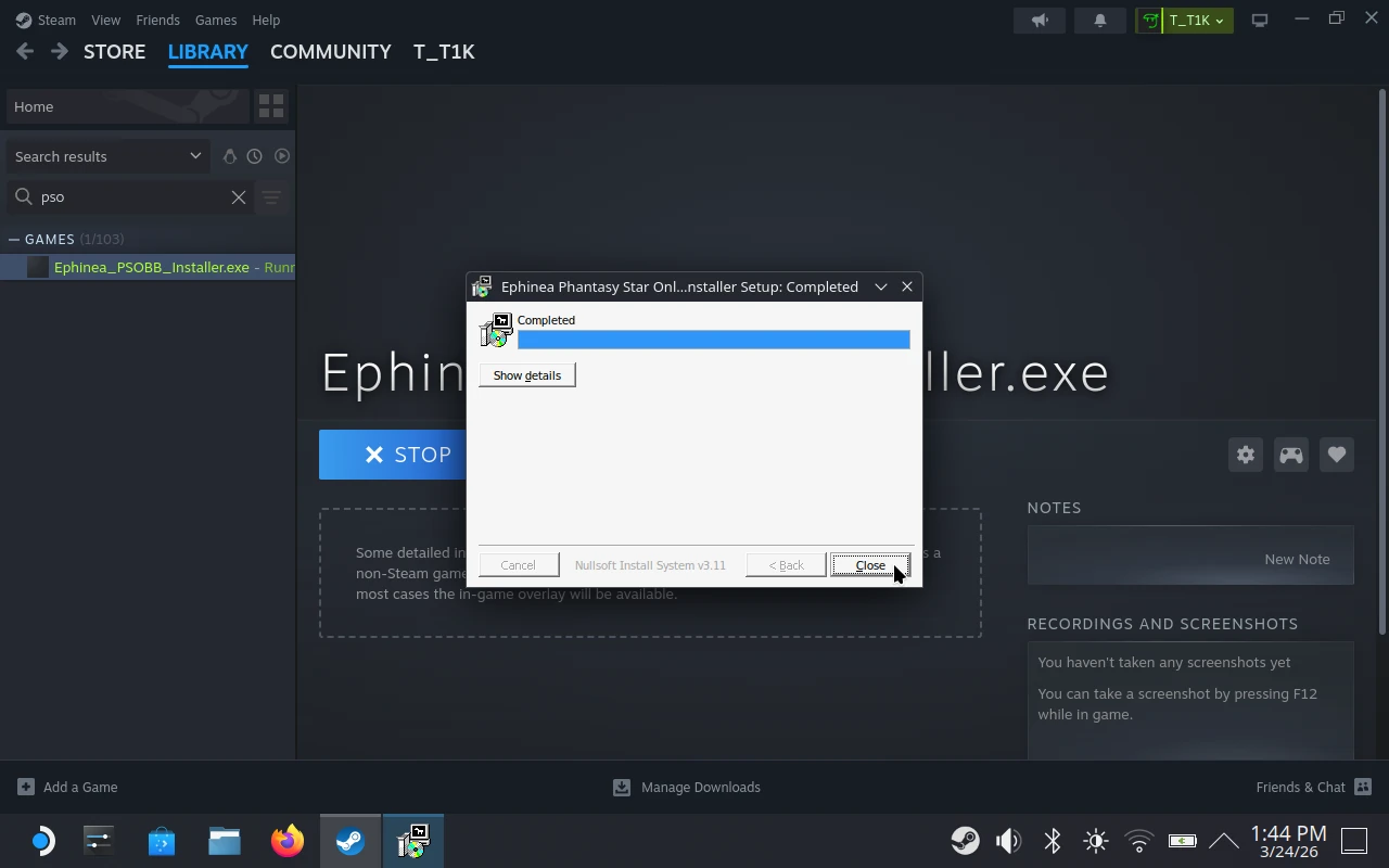 Ephinea_PSOBB_Installer.exe→ Add to Steam. - Open Steam and find the installer in your library.